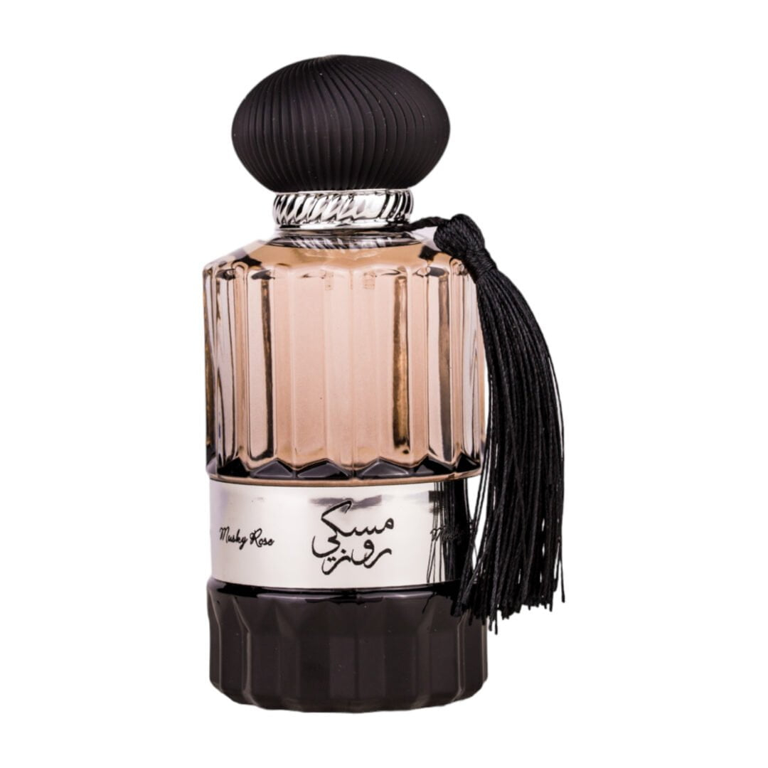 Musky Rose – Nusuk: parfum floral-oriental cu căpșuni și piper roz în deschidere, inimă florală de iasomie și trandafir, bază caldă de mosc, vanilie și patchouli. Elegant, feminin, persistent.